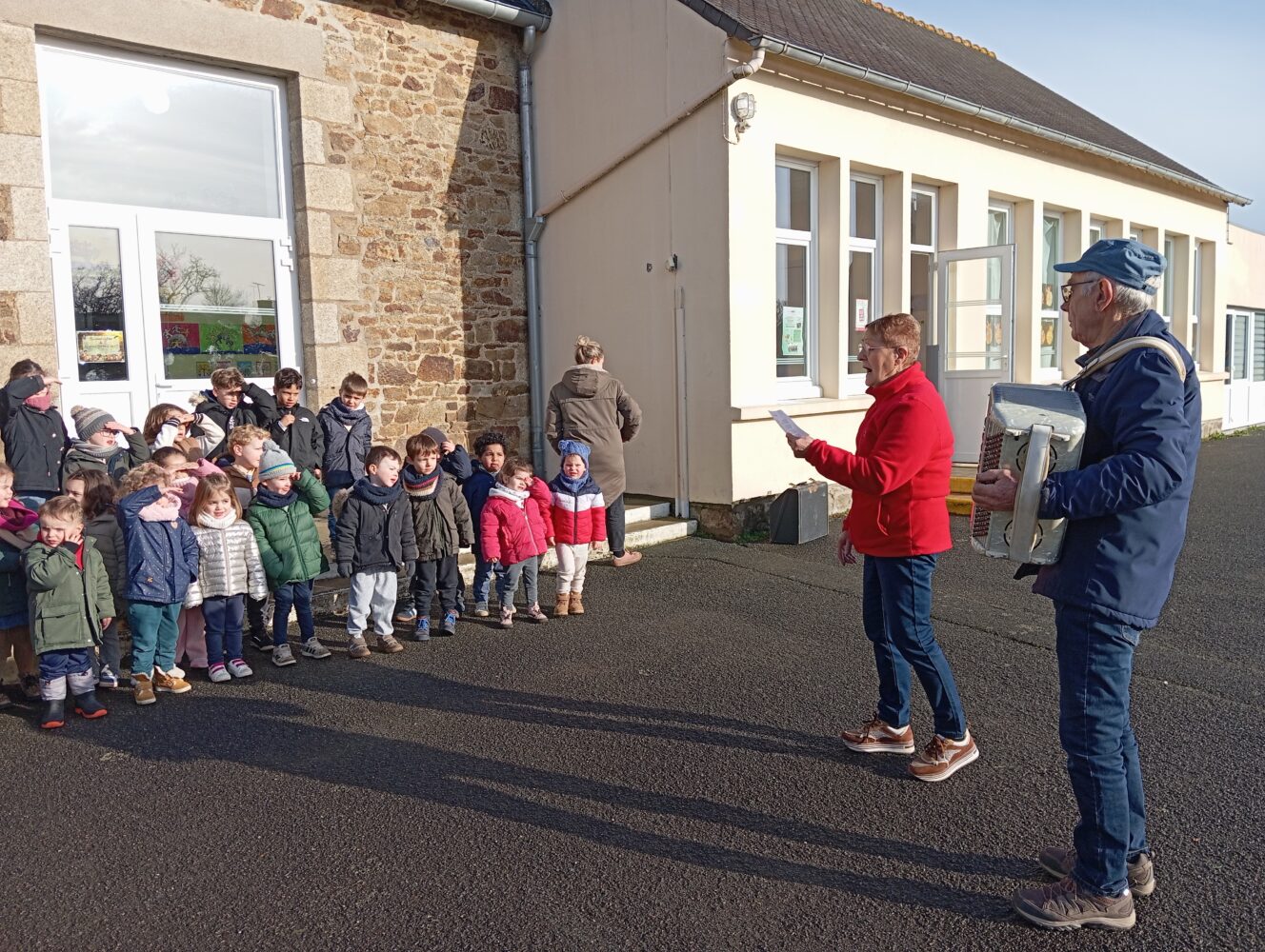 Ensuite, accompagnés de Madeleine et Arsène à l’accordéon (déjà élèves de l’école il y a plus de 60 ans), tous les élèves ont entonné quelques couplets du chant “Notre Dame de la Rivière”. Un moment chaleureux (malgré la météo) et très émouvant.